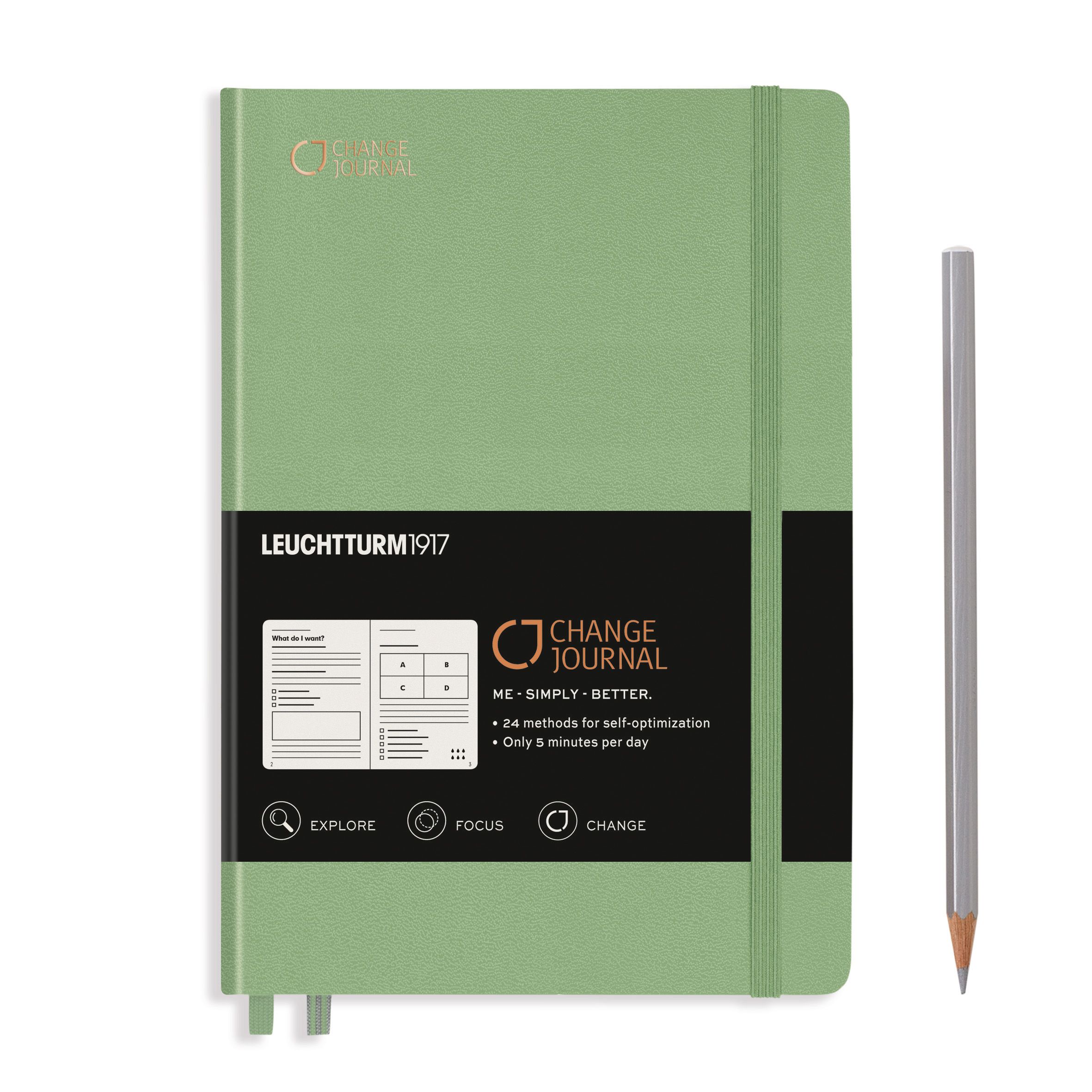 De Leuchtturm1917 notitieboeken doen het onwijs goed, maar ze hebben iets nieuws: journals! De Change Journal Sage is er als je op zoek bent naar effectieve methoden om je productiviteit en efficiëntie te verhogen. Dit boek is in samenwerking met Tim Jaudszims, oprichter en auteur van de Change Journal, en helpt jou met vragen als hoe kan ik mijn eigen kracht beter gebruiken? Hoe kan ik mijn productiviteit verhogen? Hoe kan ik mijn doelen goed en kort omschrijven?